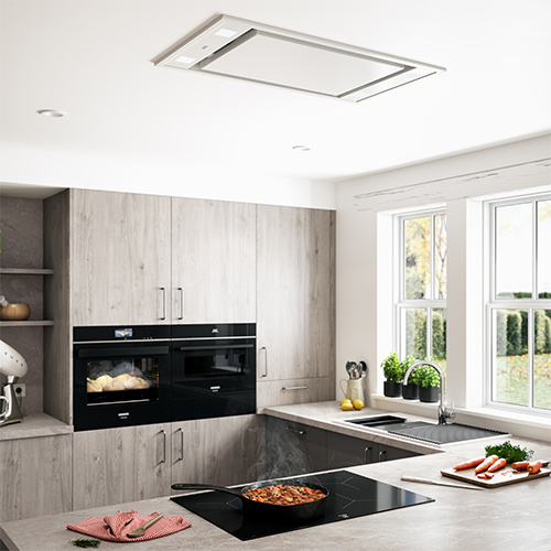 La hotte encastrée dans un faux plafond se fond dans le décor tout en offrant une aspiration puissante.
