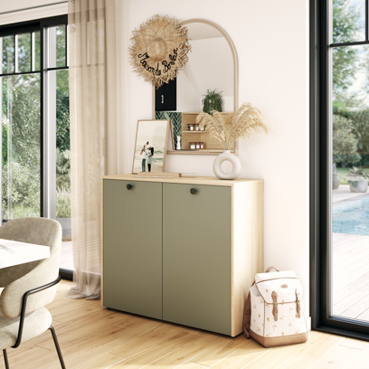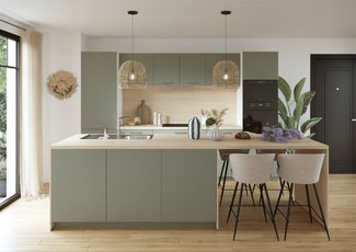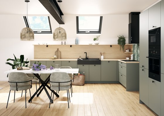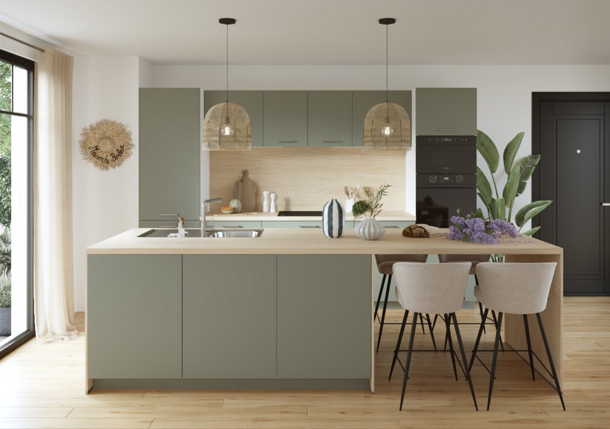 Le duo vert olive et bois clair invite au calme. Et si on méditait entre deux cuissons ?