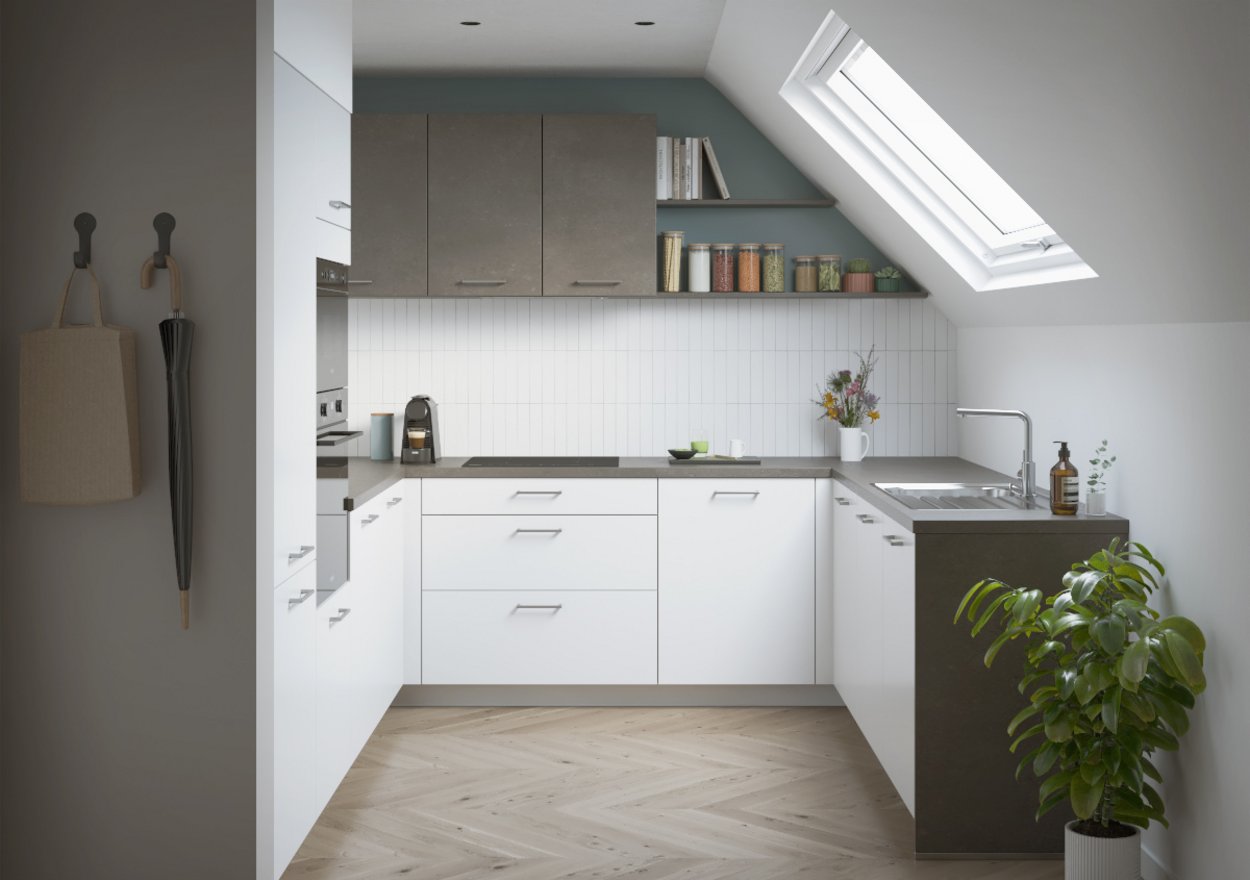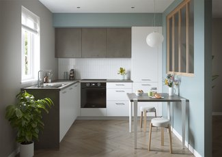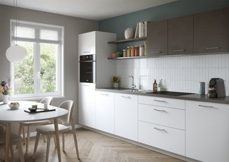 La Moda Urbaine se compose d’un four intégré en bas et non pas dans une colonne, ce qui laisse plus d’espace pour le plan de travail, tandis que les meubles allant jusqu’au plafond offrent un rangement maximal. Le plan de travail arrondi et les accessoires ajoutent quant à eux une touche sophistiquée à l’ensemble.