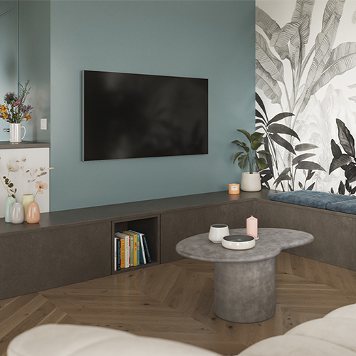 En continuité avec la cuisine, le meuble TV se prolonge harmonieusement en banquette intégrée, ajoutant des sièges supplémentaires. Idéale pour recevoir vos invités et créer un espace ouvert.