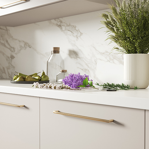 Les poignées dorées​ des meubles confèrent à l’espace une atmosphère sobre et épurée et apportent une touche de design à votre cuisine.